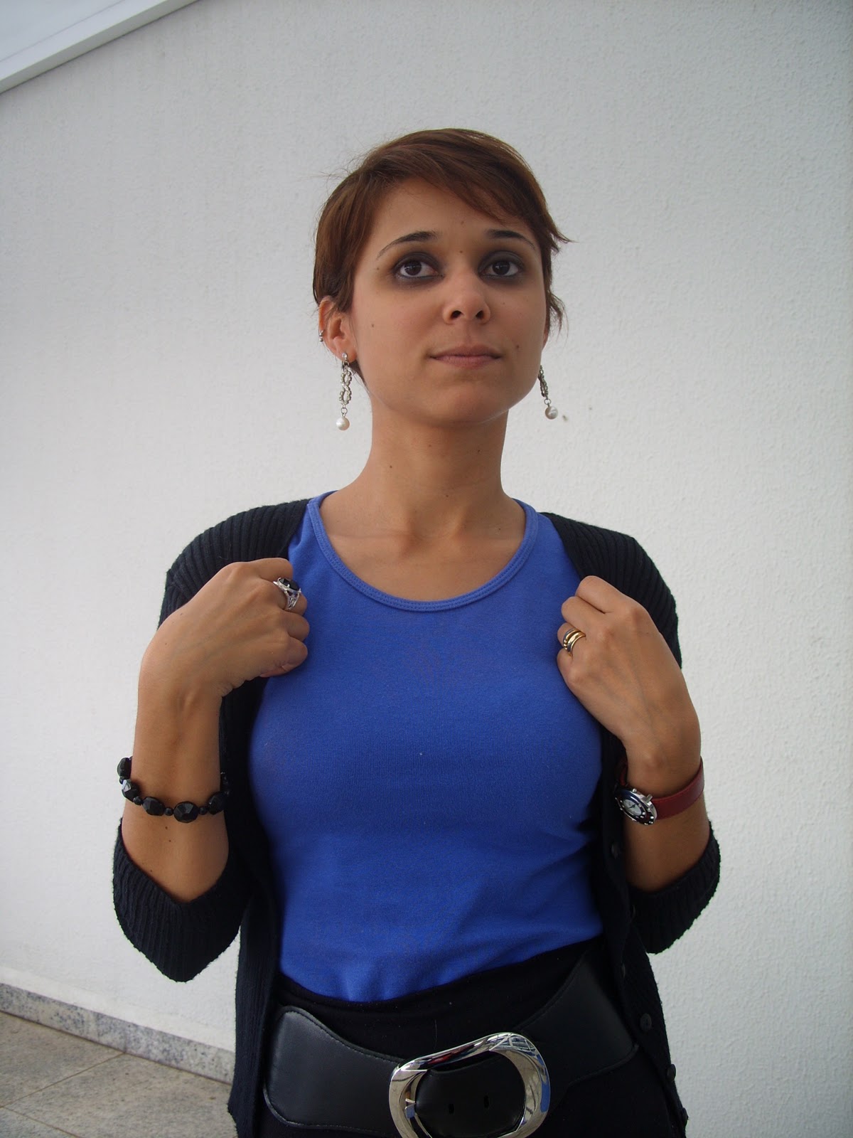 Vamos ao look. Ele não está dos meus preferidos, mas eu quis usar a meia de corações que Marido me deu de presente de Natal. Ele diz que gosta de me presentear com o que faz meus olhos brilharem quando eu vejo. Esta meia estava de R$ 9,90 dinheirinhos na Renner e ele não hesitou em comprá-la. A saia é a de sempre, o sapato também, a blusa eu amo de paixão, super básica e azul, cor que eu acho que combina comigo e o cinto mara. Aliás, preciso que meus olhos brilhem por cintos, mas ainda não achei nada que me agrade ou caiba em minha cinturinha de pilão.